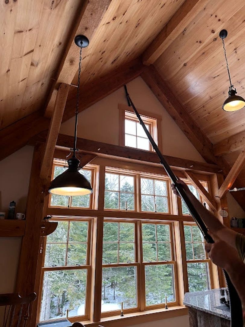 "My home is a new timber frame, completed in 2023. There is a beautiful bank of windows in the kitchen, pendant lights, a ceiling fan, and timbers made of rough-sawn hemlock and fir. Many hard to reach places, and high places to clean to say the least! Mainely Peaks service is excellent. They are professional. Their equipment is efficient and effective (many attachments designed specifically to get to those hard-to-reach places). They are knowledgeable and skilled at handling all their equipment. They offer all this with the added bonus of being very thoughtful of all the belongings in my home as they work. So excited to have found them!"